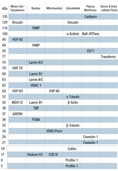 以下這張圖歸納了不同細胞組分(fēn)對應的内參及其分(fēn)子量,掌握了這張圖,内參選擇不再難。快動動你的手指收藏起來吧!