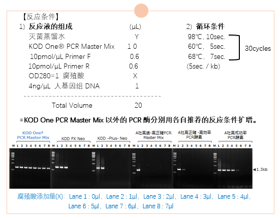 東洋紡産(chǎn)品KOD OneTM PCR Master Mix/ KOD OneTM PCR Master Mix -Blue-(Code:KMM-101/KMM-201)因其對土壤腐殖酸的高度耐受而廣受好評。并且在含有(yǒu)腐殖酸的人類基因組模闆下,都可(kě)以輕松實現HBg基因的擴增。