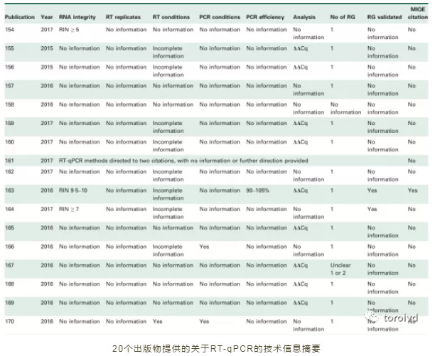 結果再現性問題2013年,《自然》(Nature)雜志(zhì)發表的一篇論文(wén)綜述得出結論,自MIQE指南發布以來,有(yǒu)關RT-qPCR方案的必要信息的報告實際上有(yǒu)所惡化。雖然指南強烈建議納入必要的技(jì )術信息,但分(fēn)析的10篇論文(wén)中(zhōng)沒有(yǒu)一篇報道了這一信息。這意味着沒有(yǒu)向讀者提供任何有(yǒu)關RNA完整性、RNA純度、RT條件或PCR效率的信息,而且所有(yǒu)的出版物(wù)都使用(yòng)了一種不恰當的數據分(fēn)析方法,這種方法在15年前已經被質(zhì)疑。作(zuò)者對《自然》雜志(zhì)的20篇近期論文(wén)進行了重複分(fēn)析,得出了基本相同的結論。更諷刺的是,報道透明度與期刊的影響因子呈負相關。