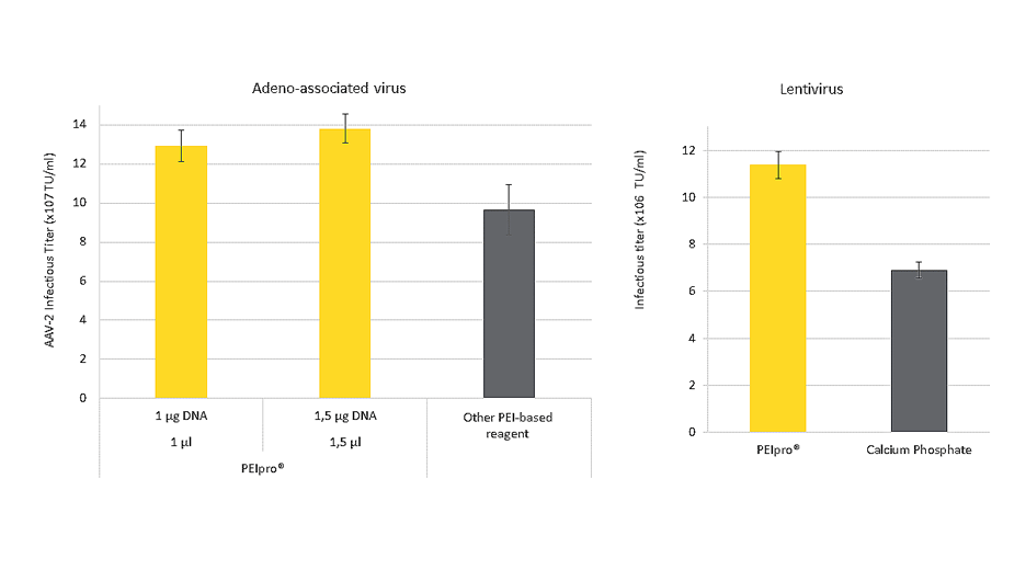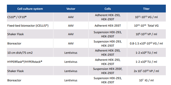無論基于細胞培養的系統和生産(chǎn)規模如何,對于慢病毒和AAV, PEIpro®和PEIpro®-HQ的有(yǒu)效病毒載體(tǐ)産(chǎn)量分(fēn)别優于107IG/mL和109vg /mL。