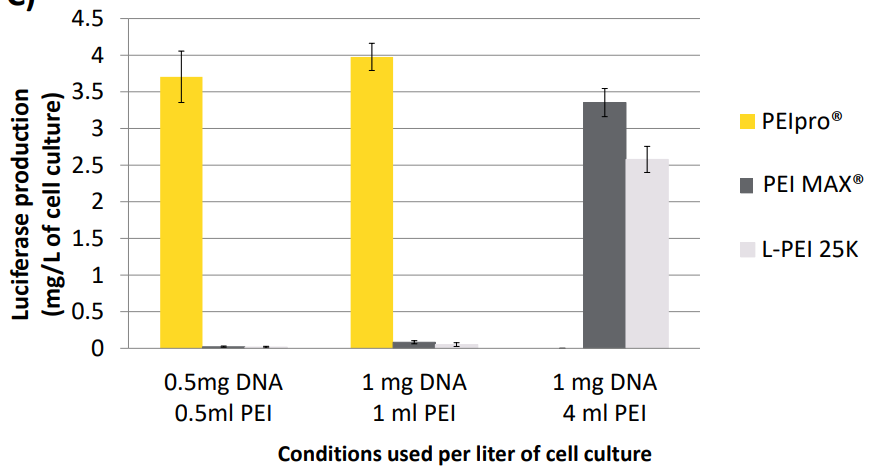 與其他(tā)PEI相比,PEIpro®所需試劑較少,DNA用(yòng)量也較低。将HEK-293懸浮細胞以1 × 106/ml的濃度接種于無血清培養基中(zhōng),用(yòng)PEIpro®、PEI MAX®和L-PEI 25 kDa轉染。轉染48 h後用(yòng)常規熒光素酶法檢測熒光素酶的表達。