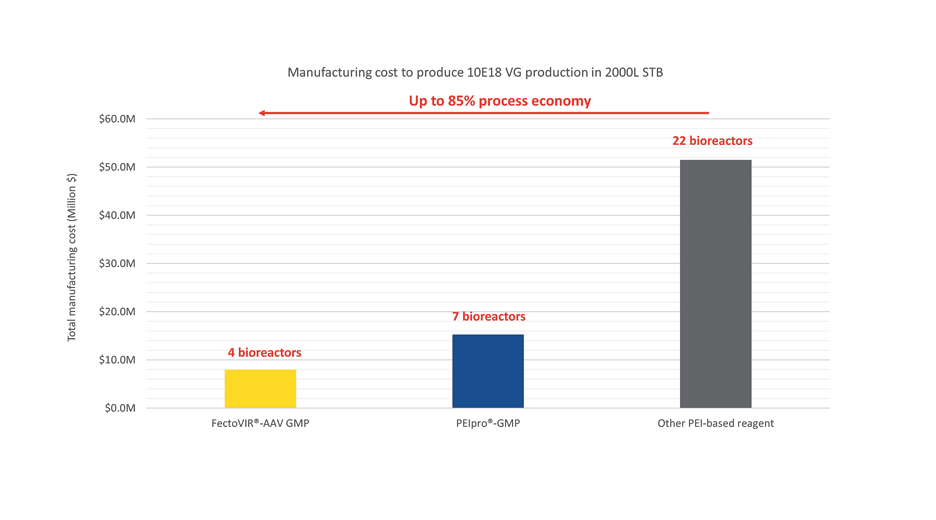 下圖:FectoVIR®-AAV通過高生産(chǎn)率大大降低制造成本。對在2000L STR中(zhōng)生産(chǎn)10E18的AAV進行成本建模,基于