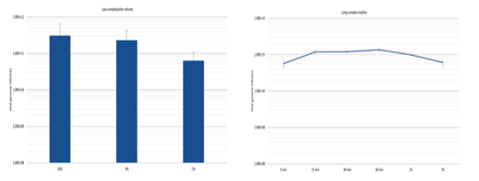 左圖:複合物(wù)工(gōng)作(zuò)體(tǐ)積:由10%減至1%。右圖:複合物(wù)穩定性: 可(kě)延長(cháng)至6小(xiǎo)時
